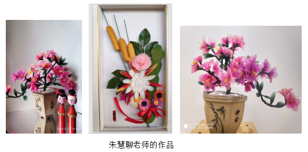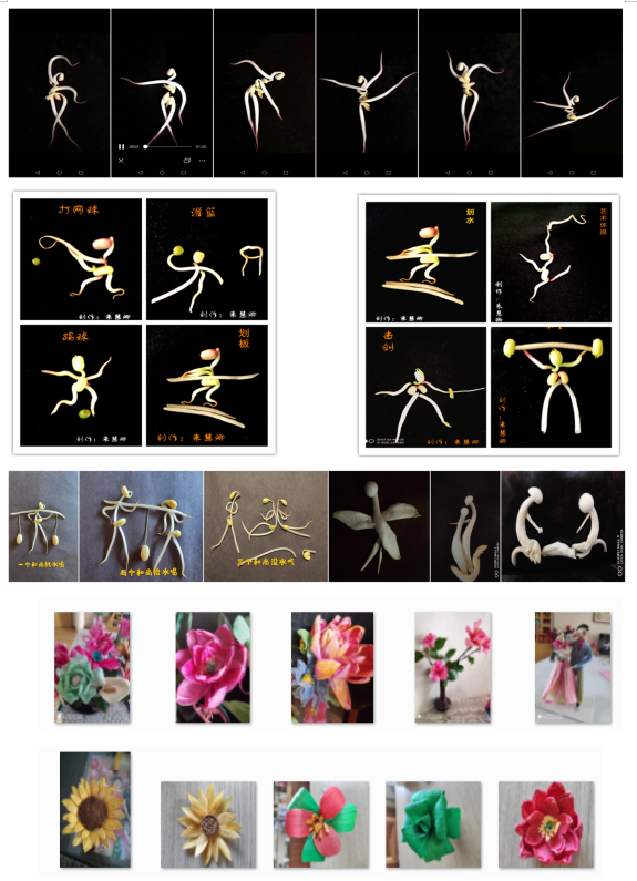 好玩的还在后面,朱老师自我创新,充分利用身边易取材料,教我们自制豆芽到用豆芽摆各种形态的图案,老师用她摆出的图案还自拍制成芭蕾舞《天鹅湖》的视频,引来一片赞许。大家急不可待跃跃欲试,做出了一组组故事系列,还有同学想到用鸡腿茹摆图案,真是创意无限;玉米上市季节,老师还教我们用玉米皮做花束等等,这大大激发了姐妹们的兴趣和创新思维。甚至于家人、身边的朋友和网友们也都积极的参与进来,大家越做越开心,越做越起劲。这些都是大家在老师的引导下,超水平发挥做的作品。怎么样,赶快也来动动手吧。