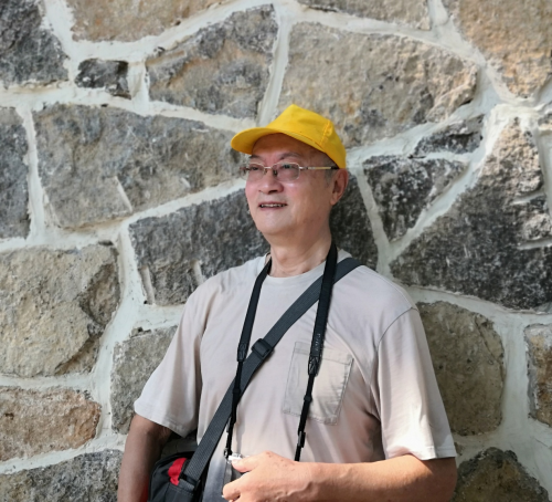 朱老师在公园门口给大家拍了集体合影,然后全程精心辅导。大家兴致勃勃,跟着老师拍各种艺术照片。因为园内游人如织,背景杂乱,影响照片的艺术性。老师就指导我们取一片有自然花纹的墙做背景。人物在墙面前摆POSE,拍摄人物特写艺术照。我也凑热闹,请小赵给我拍了一张。