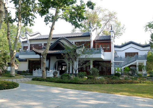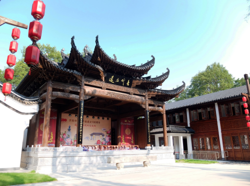 新建的“遽庄”有个大戏台,两边楼上可休闲喝茶打麻将