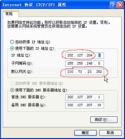 b) 同时将网关地址由原来的202.127.207.252 更改成210.73.23.252。