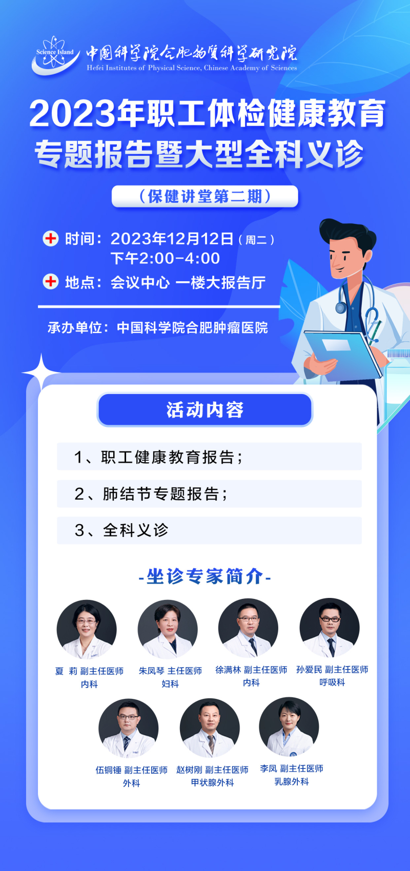 为贯彻落实积极应对人民生命健康国家战略,依据2023年度合肥物质院职工体检结果分析报告的健康问题,人事处推出第二期“保健讲堂”活动, 欢迎离退休、在职职工和学生参加,具体安排如下:
