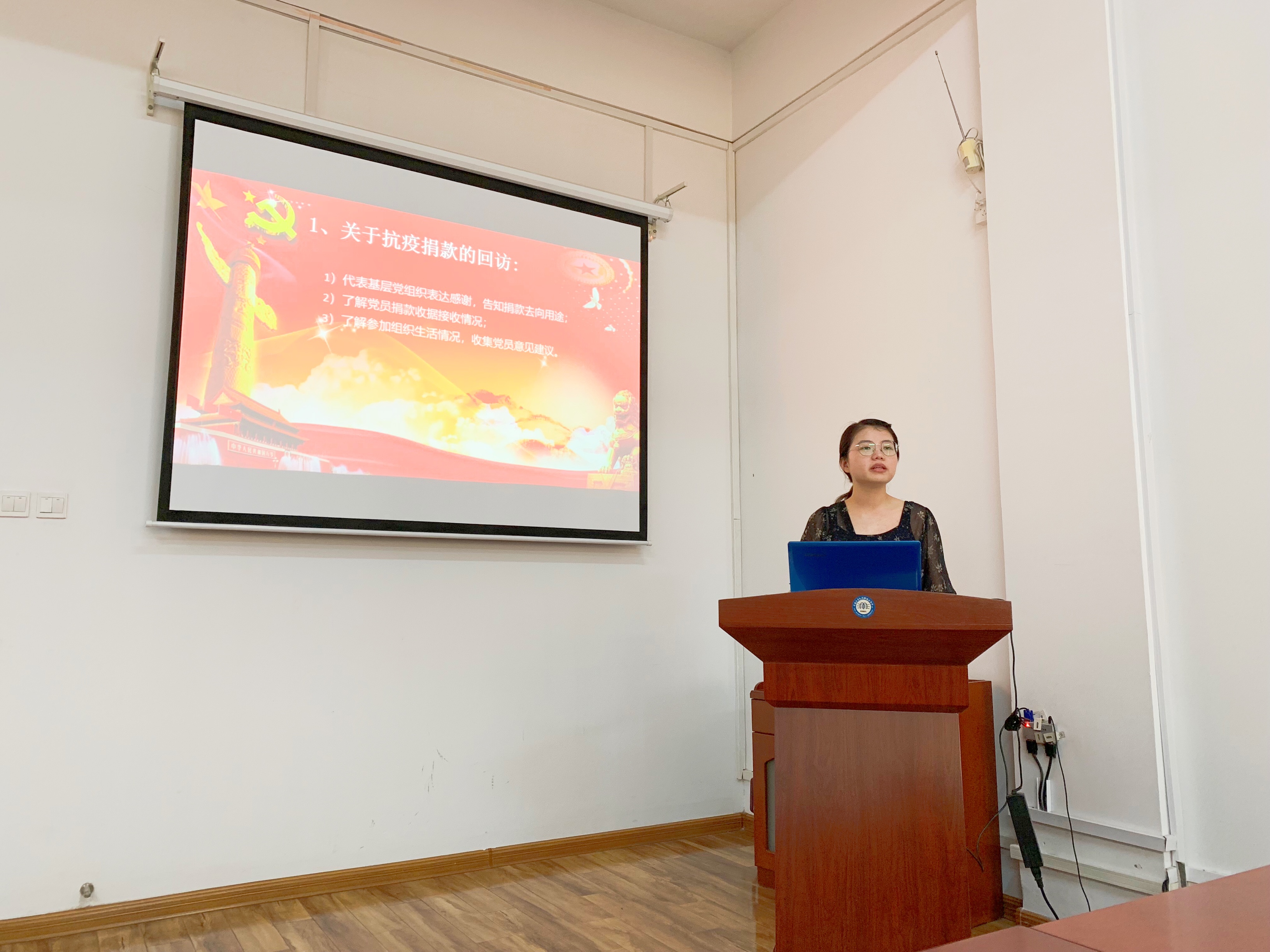 会上,操江艳同志对研究生返校前及返校后这段时间,党支部开展的各项工作进行了总结,肯定了支部全体党员在疫情期间积极配合学校、研究院及各地防控疫情举措的行为,并表扬支部中作为志愿者参与到各地防控疫情工作中的党员。她代表研究生党委对支部全体党员为抗击疫情积极捐款表示感谢,将捐款收据发放给大家,并说明了捐款的去向及用途。