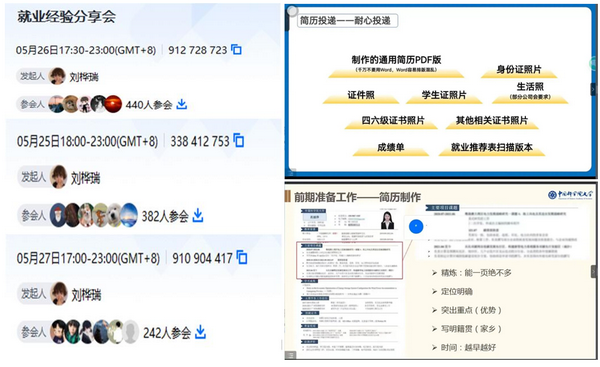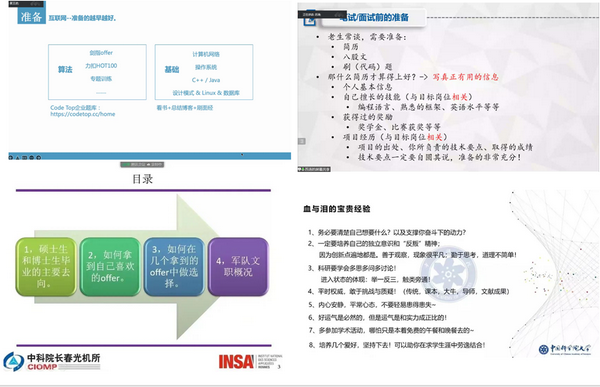 第二场“大厂”就业经验分享。邀请了广州能源研究所柯巧敏、蔡雪松,上海光机所刘美忠、林祥坤,沈阳自动化所玄金龙,合肥智能机械所夏王进、苏涛等七位师兄师姐。柯巧敏从岗位招聘渠道介绍了她关注的高校公众号,建议可在智联招聘录入个人信息,方便海投简历。蔡雪松讲述了自己对华为的向往和读研期间关注华为用人需求,直至入职华为的经历。刘美忠从前期准备、简历投递、笔试面试、签约四个阶段及各阶段注意事项进行分享。林祥坤着重介绍笔试面试的经验教训,他建议要“未雨绸缪”,避免面试时“哑口无言”;同时仔细对比分析各家“性价比”再做选择。玄金龙分享了算法岗求职经验,他从基础知识的准备谈起,介绍了“刷题+基础知识”两只脚走路的经验。夏王进讲述秋招提前批,让大家走出提前批难于正式批的误区。苏涛着重分享准备、注意事项和拿到offer后的正确心态。