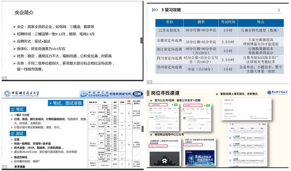 本次活动第一场为“国企、选调”经验分享。来自广州能源所周逸伦、高丽萍、沈聪,合肥智能研究所陈永、张伟五位师兄师姐分享了各自求职经验。其中,周逸伦从简历制作、投递和面试三个方面进行了分享;高丽萍分享了“我的求职经历及建议”;入职央企的沈聪从央企简介、面试技巧和代为效益评估三个方面进行了分享;陈永从定向选调报考流程、复习及复试攻略和个人心得三个方面分享了自己定向选调的经验;张伟分享了银行信息科技岗实习与求职经验。