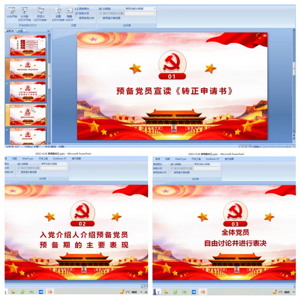 首先进行的是预备党员转正大会,按照预备党员转正规程,由滕国鹏同志宣读转正申请书,就自己预备期以来的政治思想、学习、生活及工作等各方面情况进行了全面的介绍,对进步之处进行了说明,对不足之处表明了改进的决心。随后由解文滕同志和孟晶晶同志对其预备期内的主要表现进行了评议,一致肯定了滕国鹏同志科研生活上的优异表现,希望他在未来的日子的积极参加党内活动,坚定不移跟党走,努力成为优秀党员。经支部大会线上投票,与会党员全票表决通过,同意滕国鹏同志转为正式党员。