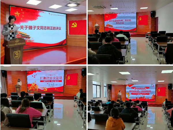 支部全体党员共组成八个学习小组,每个学习小组自行确定讲课主题,并制作相关海报。本次党员大会由第一至第四学习小组讲课,分别从“打赢脱贫攻坚战”、“汲取四史智慧,推进复兴伟业”、“2023年全国两会知识总览”和“党的二十大报告要点速读”等四个主题带领大家一起回顾了中国共产党前仆后继,艰苦奋斗的光辉历程,让大家深刻感受到党敢于斗争、坚持斗争的奋斗精神和全面建设社会主义现代化国家、全面推进中华民族伟大复兴的必胜决心。其中关于2023年全国两会和二十大报告的介绍紧跟时事、重点明确,加深了大家对于两会和二十大的理解,受到大家的一致好评。