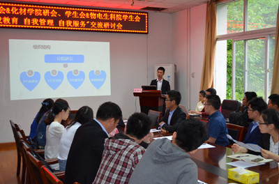 上午10点30分交流会正式开始,会议主要内容有:有效增强学生会团队的凝聚力,提高学生会成员的工作热情和积极性;促进学生会创新发展,创新活动构思;有效开展学生活动,增强学生“三自功能”,提高自我教育、自我管理和自我服务工作实效;提升学生会在学生心中的价值与形象;实现学生干部自身的健康成长与发展。科学岛分院研究生会副主席张昭、安师大化学与材料科学学院研究生会主席党倩、生命科学学院学生会主席王正一、物电学院学生会副主席秦梦雅、科学岛分院研究生会主席丁守军、体育部田兴、办公室李遗祥与黄栋梁先后发言。最后,在蒋建伟老师与袁青兵老师的总结与指导下,结束了此次为期一天的交流活动。