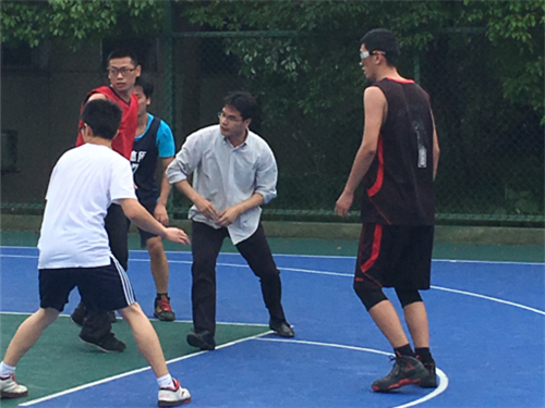 既是友谊赛,心态当然轻松不少,我们邀请了院研究生处处长梁长浩老师参与到比赛中来,才知道,原来年轻并非局限于年龄,而是一种心态。梁老师虽然在场上时间不多,然而他矫健的身姿和投篮命中率给大家留下了深刻的印象。而我们可爱的张艳丽老师,一边在场边拍着篮球,一边为同学们喝彩。