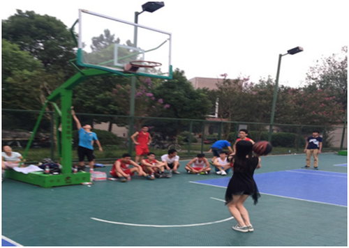 本次篮球赛是由2015级研究生组成的新生队迎战高年级研究生组成的老生队两队对垒。与往届篮球赛不同的是,在比赛之初,现场的八位女生开始进行原地点球,所投中的个数将会计入各队的分数,这种环节带动整场的气氛,极大地鼓舞了篮球赛队员们的士气。