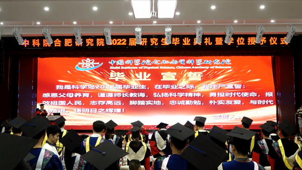 6月24日上午,合肥研究院隆重举行2022届研究生毕业典礼暨学位授予仪式。合肥研究院院长刘建国、党委书记黄晨光、党委副书记兼纪委书记邹士平、副院长吴海信、副院长王俊峰、副院长程艳、总会计师陈宗发,各科研单元研究生教育分管所领导、环光学院副院长翁宁泉、导师代表等出席典礼,1000余名毕业生和毕业生亲友们通过线下和线上直播的方式共同参加了本次典礼。典礼由研究生处处长李贵明主持。