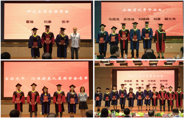 马祖长副所长宣读优秀毕业生名单并颁奖;李贵明处长宣读国家奖学金名单并颁奖;徐伟宏副处长宣读 “悦群品学兼优”奖学金名单并颁发证书;孙凌云副处长宣读 “光华奖”、“江淮蔚来之星”奖学金名单并颁发证书。毕业生依次上台领奖并合影留念。