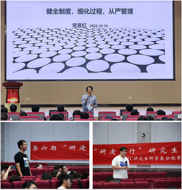 随后,“研途同行”四位嘉宾为同学们作报告分享。首先是张伟老师,他以《做最好的科研,看最美的风景》为题,向大家讲述了从大学生到博导的经历感悟,强调科研课题及方向的重要性,同时鼓励大家在科研道路上多付出、多交流、多主动、多思考、多加压。吕一鸣博士,他以《坚持拼搏,突破自我》为主题,鼓励大家坚持不放弃,保持乐观的心态,抓住每一次机会,努力比昨天的自己更好。王维俊博士,他以《我所经历的科研与体会》为主题,向大家介绍了他是如何从一名普通的安全工程专业的本科生成长为一名核能科学与工程的复合型科研人才。孟令义博士,他以《好心态是顺利毕业的必要条件》为题,鼓励大家以良好的心态去健康地生活,当我们拥有积极的心态时,会更加主动地去学习和探索知识,去认真地工作。四位嘉宾的报告博得同学们赞叹,现场的同学们热情高涨,积极提问,与嘉宾们展开了深入的交流,并励志学习他们坚守理想、乐观向上、刻苦攻关、积极奉献的优秀科研品质。