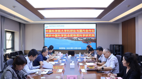 10月30日下午,由中国科学院大学科研处副处长刘彦带队,与国内合作处霍鹏等一行6人到访合肥物质院调研交流。合肥物质院科技促进发展处处长邓国庆、研究生处处长李贵明、副处长徐伟宏,科技促进发展处和科学中心与基础设施处相关业务主管陪同调研。
