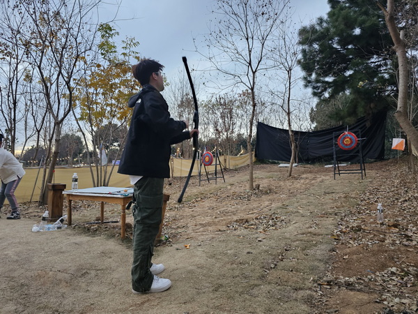12月9日下午2点,同学们共同乘坐大巴车来到拓展营地,在露营地的一处草地上,大家进行了合影。随后,开展了飞盘大战。飞盘游戏非常考验团队之间的配合,同时对体能也提出了较高要求,在这场酣畅淋漓的飞盘大战中,同学们之间的距离被迅速拉近,飞盘游戏大大增加了同学们之间的友谊。射箭游戏是一种结合技巧、专注力和精准度的体育活动,这项运动不仅考验参与者的手眼协调和身体平衡能力,还考验他们的耐心和冷静。