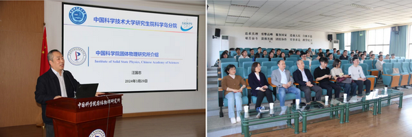 在固体所学术报告厅,研究所副所长汪国忠从历史沿革、学科建设、科研成果、人才培养、学生待遇、研究所文化等角度,全面介绍了固体所的发展情况。他表示,固体所是适合青年人才成长的肥沃土地,是培养材料研究高端人才的摇篮,期待更多的同学了解固体所、加入固体所。