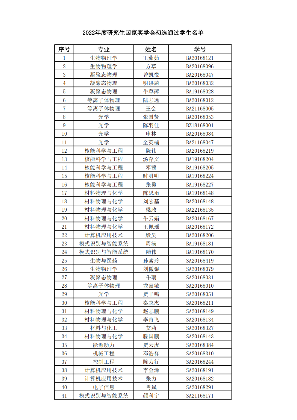 根据《中国科学技术大学关于做好2022年国家奖学金评选工作的通知》要求,经研究生个人申报,各科研单元奖学金评审委员会初步评议,合肥物质科学研究院奖学金评审委员会评议,通过24名博士生和17名硕士生拟入选2022年度研究生国家奖学金。现将拟入选国家奖学金的研究生名单公示如下,公示期限:2022.10.19—2021.10.25,如果对评选结果有异议,可以通过以下联系方式联系研究生处,所有初选通过学生的申报材料可供查阅。