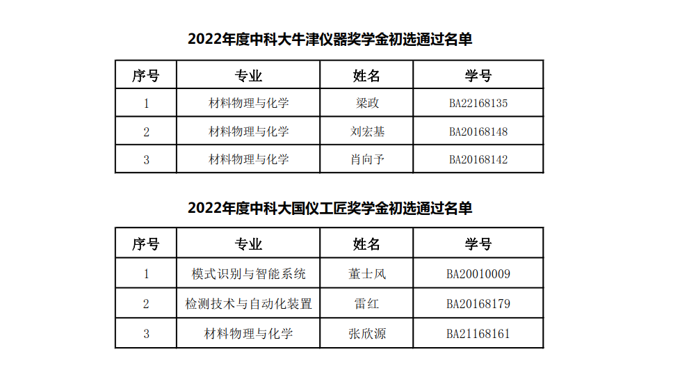 根据中国科学技术大学《关于2022年“国仪工匠奖学金”评定工作的通知》、《关于推荐评选2022年“牛津仪器明日之星奖学金”的通知》要求,经研究生个人申报,合肥物质科学研究院奖学金评审委员会评审,通过3名研究生拟入选2022年中国科学技术大学“国仪工匠奖学金”候选人,通过3名研究生拟入选“牛津仪器明日之星奖学金”候选人。现将名单公示如下,公示期限:2022.10.20—2022.10.26。