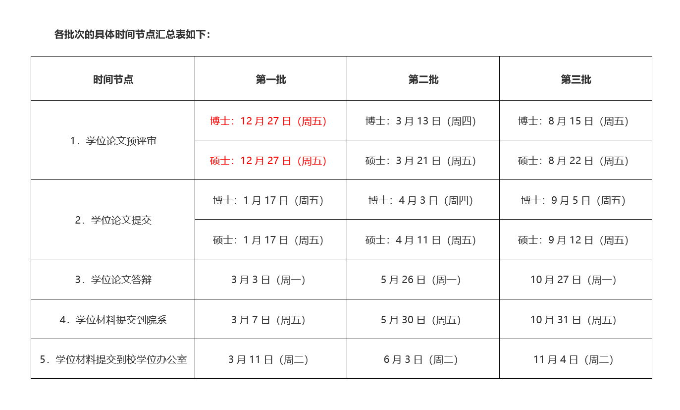 现将春季批次学位论文预评审、盲审、学位论文答辩、学位申请时间节点安排如下: