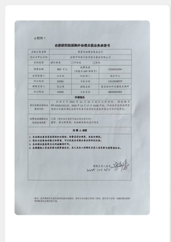 根据《中国科学院关于加强科研项目关联业务管理的暂行规定》(科发条财字〔2015〕125号)、《中国科学院合肥物质科学研究院关于加强科研项目关联业务管理的实施细则》(科合、院发资字〔2021〕8号)、《合肥研究院加强关联业务管理暂行办法》(科合院发资字〔2022〕1号)要求,现就我院委托合肥中科离子医学技术装备有限公司进行装置电磁兼容集成设计的关联业务公示。