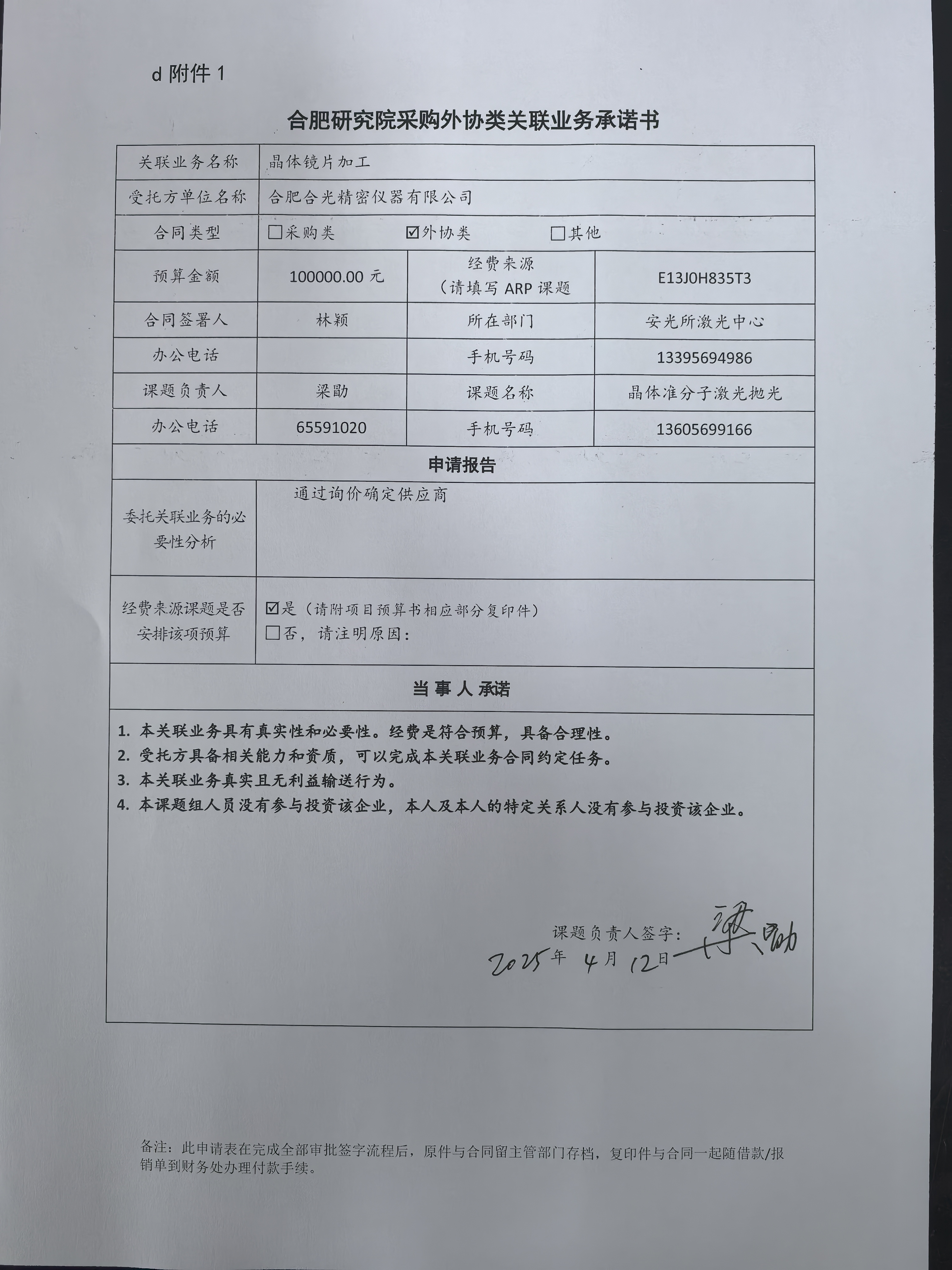 根据《中国科学院关于加强科研项目关联业务管理的暂行规定》(科发条财字〔2015〕125号)、《中国科学院合肥物质科学研究院关于加强科研项目关联业务管理的实施细则》(科合院发资字〔2021〕8号)、《合肥研究院加强关联业务管理暂行办法》(科合院发资字〔2022〕1号)要求,现就我院委托合肥合光精密仪器有限公司进行晶体加工项目进行关联业务公示。