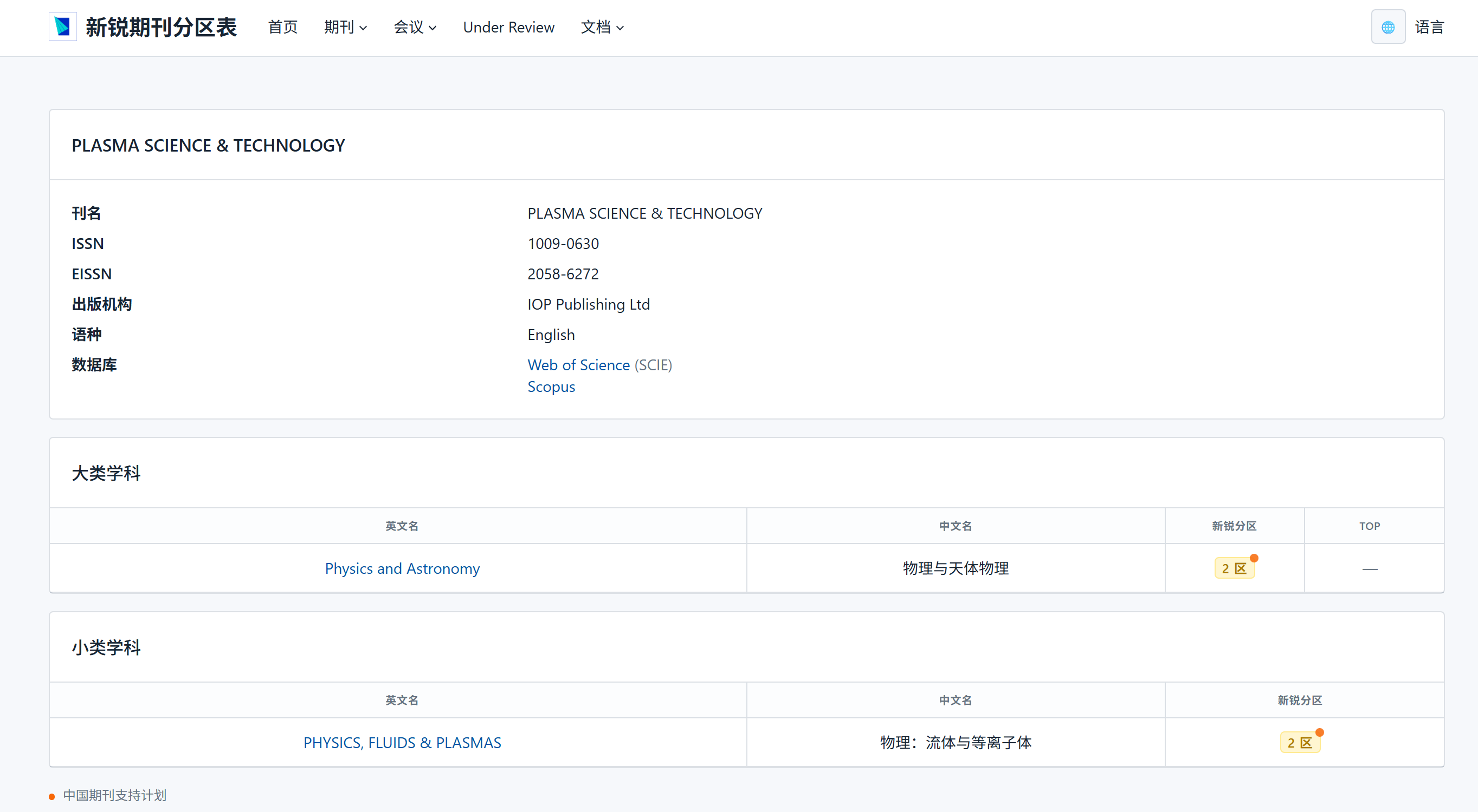 2026 年 3 月 24 日,由新锐学术研制的《新锐期刊分区表》(原中国科学院期刊分区表团队)正式发布。Plasma Science and Technology(《等离子体科学和技术(英文)》,PST) 成功入选物理与天体物理大类2区,物理:流体与等离子体小类2区!