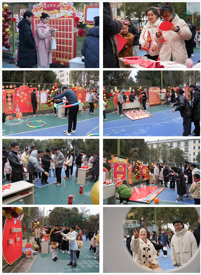 游园会在劲爆的开场舞中拉开序幕,趣味游戏激发了师生们满满的热情。“党史知多少”在寓教于乐中将“党建引领,凝心聚力”的理念植入人心;“龙舞福袋乐”项目,师生们为自己送上新春祝福;“快乐欢呼转”项目让呼啦圈在腰间飞舞;“飞运乒乓球”项目,乒乓球以一个个完美的弧线落入桶中;在“龙年钓心愿”游戏中,大家展示出了高度的专注和敏捷的反应;“龙年投中你”环节,投壶准确率不断提高。“沙包丢丢乐”和“好运龙龙套圈圈”等游戏更是引发了阵阵欢声笑语。