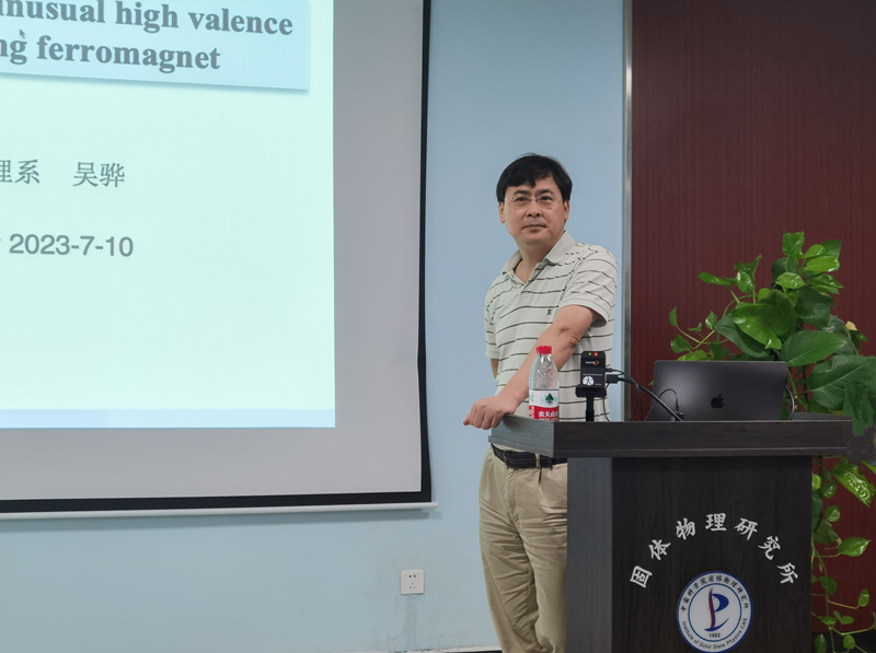 吴骅教授在报告中首先介绍了二维材料的发展背景,并指出较强的磁耦合和各项异性的磁交换作用有利于在二维材料中实现长程磁有序态;以CrSBr和VI3为例,说明由配体的三角晶体场给出的单离子各向异性可以导致二维材料基态具有Ising铁磁性。报告着重介绍了FeS2单层二维材料由于高价Fe4+离子在硫离子配体的三角晶体场下处于轨道简并的低自旋态,使其具有较大的单离子各向异性,而负电荷转移以及Fe4+离子的高价态和较强的铁d轨道和硫p轨道之间的杂化,导致体系中的铁磁性超交换作用很强,因此预测该二维铁磁材料具有很高的铁磁相变温度。然而蒙特卡罗计算结果表明,由于实际体系中存在硫空位,从而导致体系中的Fe3+离子增多,抑制了单离子磁各向异性,所以实验显示该材料磁相变温度很低。该研究结果表明,可以在具有轨道简并的高价态二维材料中搜寻具有较高磁相变温度的铁磁材料。报告过程中,吴骅教授与参会师生进行了热烈的交流和讨论。