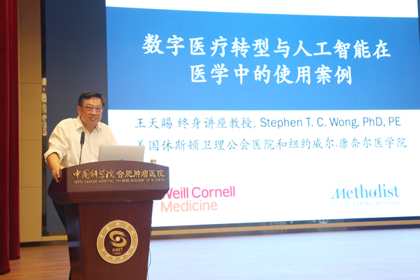 8月31日上午,美国德克萨斯州休斯顿卫理公会医院和纽约威尔康奈尔医学院王天赐教授访问中国科学院合肥物质院健康所,并作为“医路研谈”大讲堂第五讲的报告人,在医院多功能学术报告厅作《数字医疗转型与人工智能在医学中的使用案例》专题报告。健康所党委书记、肿瘤医院院长王宏志,及健康所科研人员、研究生、肿瘤医院医务人员等300余人参加活动,健康所所长助理、肿瘤医院副院长王恩君主持报告会。