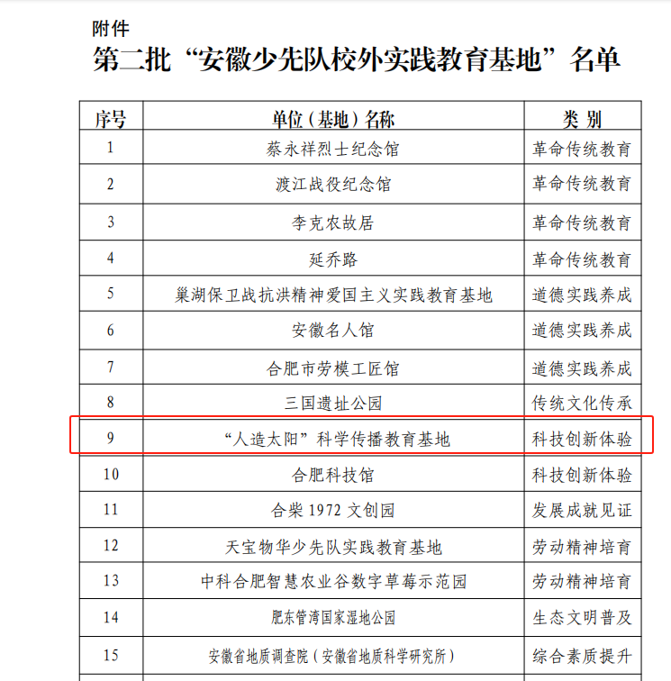 近日,共青团安徽省委、少先队安徽省工作委员会联合发布《关于命名第二批“安徽少先队校外实践教育基地”的通知》,等离子体所团委依托建成运行的聚变创新展览馆,申报并入选科技创新体验类“安徽少先队校外实践教育基地”。