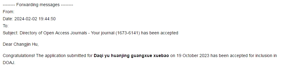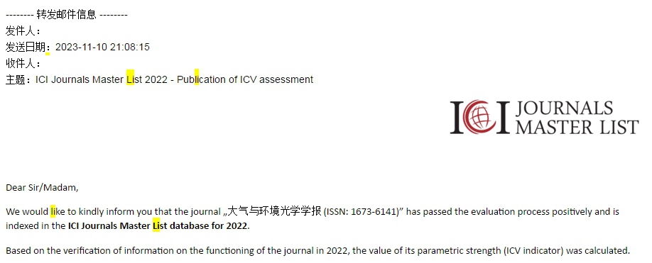 《大气与环境光学学报》被ICI和DOAJ数据库成功收录