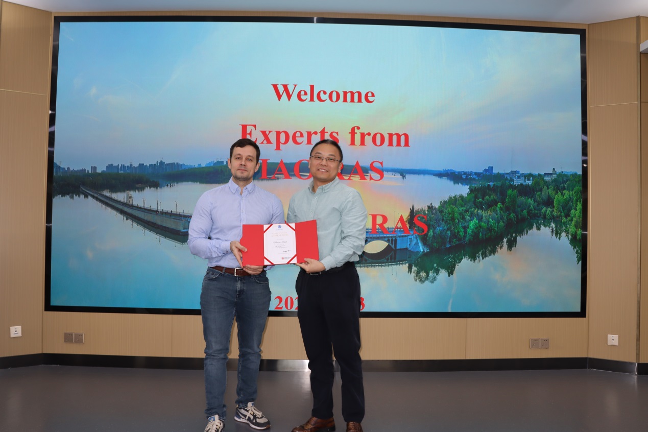 随后,安光所副所长赵卫雄研究员为Maksim Trigub教授颁发中国科学院国际人才计划(PIFI)特聘教授证书。安光所大气光学研究中心副主任刘东研究员参加了会议研讨。