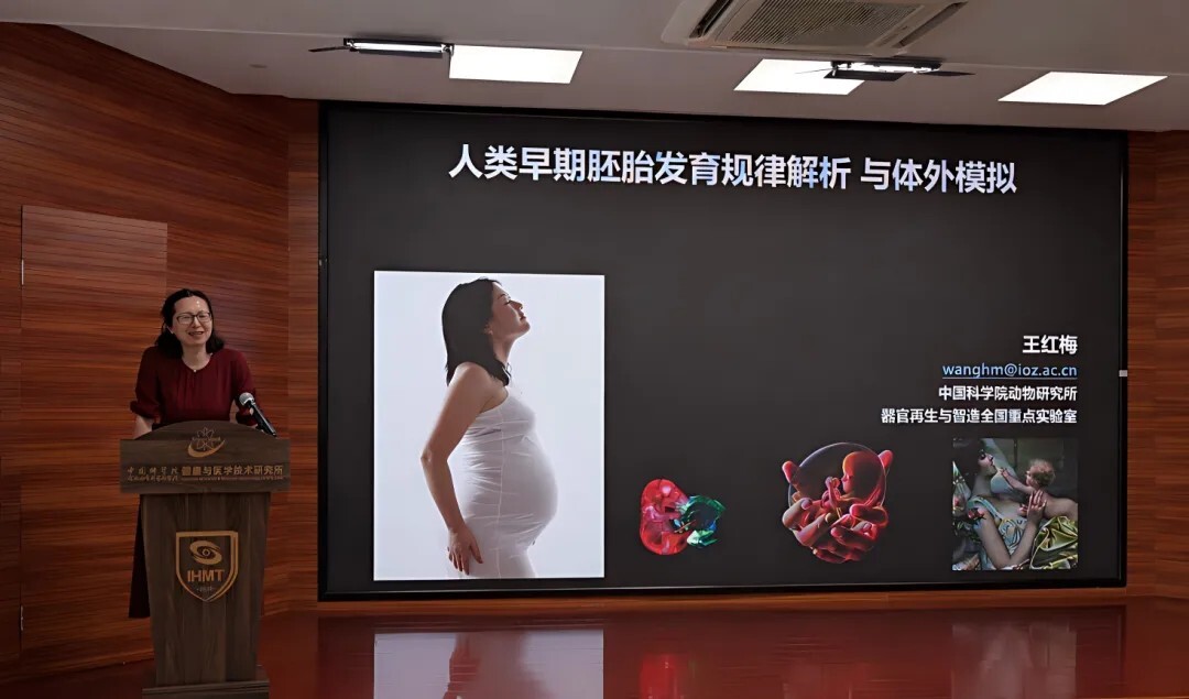 王红梅研究员以《人类早期胚胎发育规律解析与体外模拟》为题,介绍了利用非人灵长类(食蟹猴)胚胎体外培养模型突破人类胚胎“14–28天黑匣子”发育阶段的研究进展。通过二维、三维培养体系,成功将猴胚胎培养至25天,解析了原肠运动、神经外胚层发育等关键事件。此外,她还系统阐述了胎盘起源、多核化机制、妊娠期母体器官适应性改变及人工胚胎/类器官构建等研究。