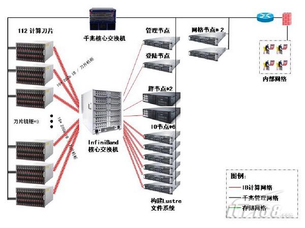 经过中央国家机关政府采购中心组织招标,最终由浪潮公司中标。据了解,针项目需求,并结合浪潮多年来在化学、物理、大气、生物等科研领域高性能集群技术应用的深刻理解,浪潮特别推出了“高单点配置、采用DDR InfiniBand计算存储网络、搭配高性能核心千兆以太监管调度网络、高效能电源(可达93%转换效率)、统一远程集群管理的,基于Intel 45nm 至强5500(Nehalem)处理器的天梭TS10000高性能集群解决方案”,由1台管理节点、1台双路登陆节点、2台网格节点、6台并行IO节点以及112台刀片计算节点构成。