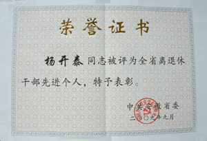 杨开泰同志现已88岁。早年参加中国革命,从枪林弹雨中走来,又积极投身于祖国的建设事业50多年,为祖国的解放和新中国的建设立下汗马功劳。1985年离休后,始终保持共产党员的革命本色,活到老,学到老;始终关心国家的改革和建设,关心支持单位的创新和发展,积极参加党支部的学习活动,积极为单位的科研工作、园区建设献计献策,发挥了党员的模范带头作用。2008年四川汶川发生特大地震,他自己和老伴都高龄多病,经济上并不富裕,但他却积极主动为灾区人民献爱心,多次捐款捐物,受到大家的好评。