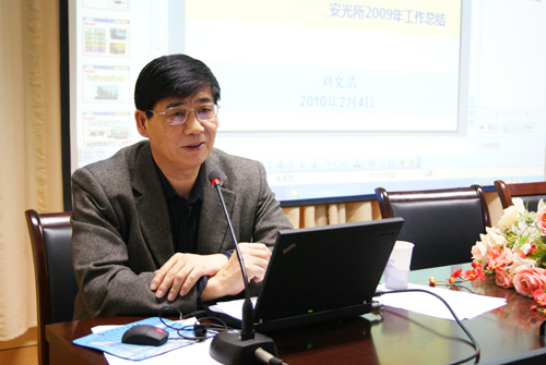 刘文清回顾了2009年研究所开展的主要工作,对研究平台建设、在研项目、新增项目、学科布局及科技发展目标等方面工作进行了全面、详细的总结,介绍了研究所各科研机构在过去一年中的科研工作成绩和取得的突破等内容。同时,对2010年的重点工作进行了部署,他指出,2010年全所上下要全力处理好三期创新与面向2020年的创新工程规划衔接,特别是要下大力气圆满完成 “十一五”任务,处理好与“十二五”规划启动的衔接。同时结合任期目标做好全所跨越发展的战略规划,力争“十二五”在国家重大科学研究计划、科学院跨所跨学科重大科研项目、国家杰出青年基金等方面承担更多国家重大科研任务。以人为本,加强创新人才团队建设,努力实现“一流管理”,端正学风,坚守学术道德,弘扬科学精神,加强创新文化建设,加强技术支撑系统建设,继续重视科研环境建设,不断改善职工工作条件,不断提高职工收入。