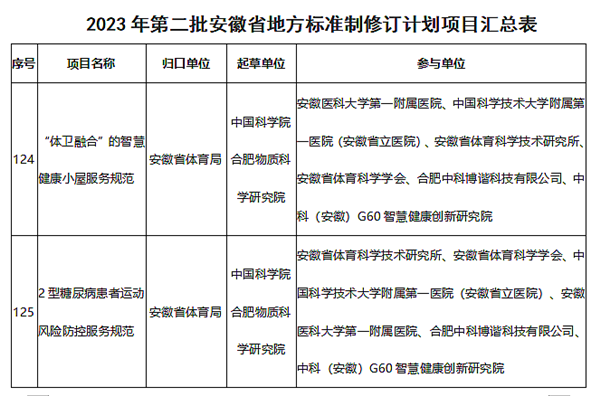 近日,安徽省市场监督管理局公布了2023年第二批安徽省地方标准制修订计划项目。经公示完毕后,由中国科学院合肥物质院牵头申报的两项安徽省地方标准《“体卫融合”的智慧健康小屋服务规范》《2型糖尿病患者运动风险防控服务规范》获批立项。