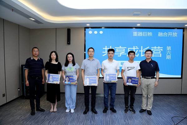 科学中心处副处长伍德侠和智能所综合办主任刘善文为“共享成长营”前五期嘉宾颁发纪念照片