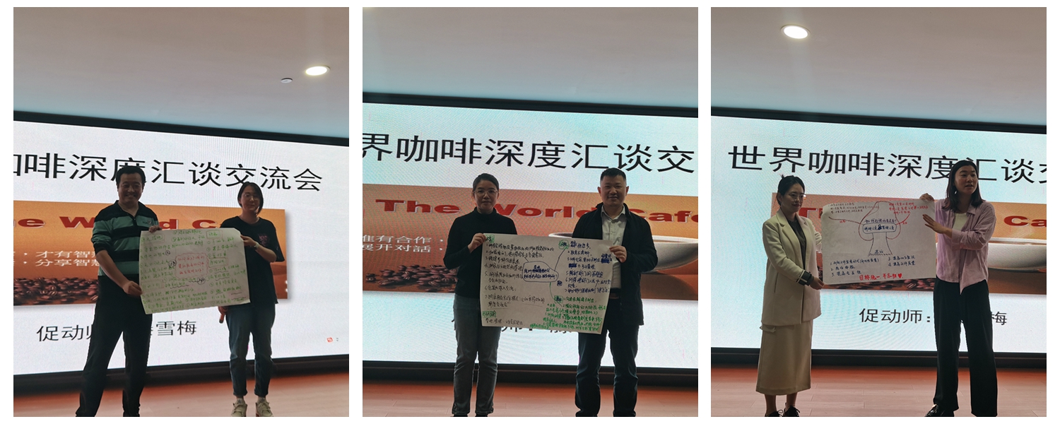 座谈交流环节,院办滕雪梅以促动师的角色带领参培人员运用“世界咖啡工作坊”方式,展开了一场生动活泼且“跨界”高效的交流。参培人员分组确定议题并以轮桌会谈的形式,对议题进行了深入式探讨,发表各自的见解,互相意见碰撞迸发“创新点”,形成措施和行动计划,充分体会到“唯有合作,才有智慧;展开对话,分享智慧”的良好交流氛围。