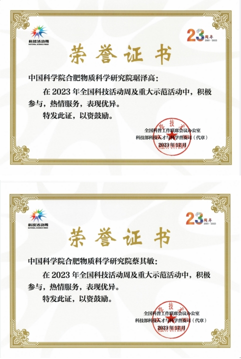 近日,全国科普工作联席会议办公室、科技部科技人才与科学普及司共同表彰在2023年全国科技活动周及重大示范活动中积极参与、热情服务、表现突出的单位与个人,合肥物质院合肥现代科技馆外联兼宣传工作主管琚泽高和等离子体所科普主管蔡其敏受表彰。