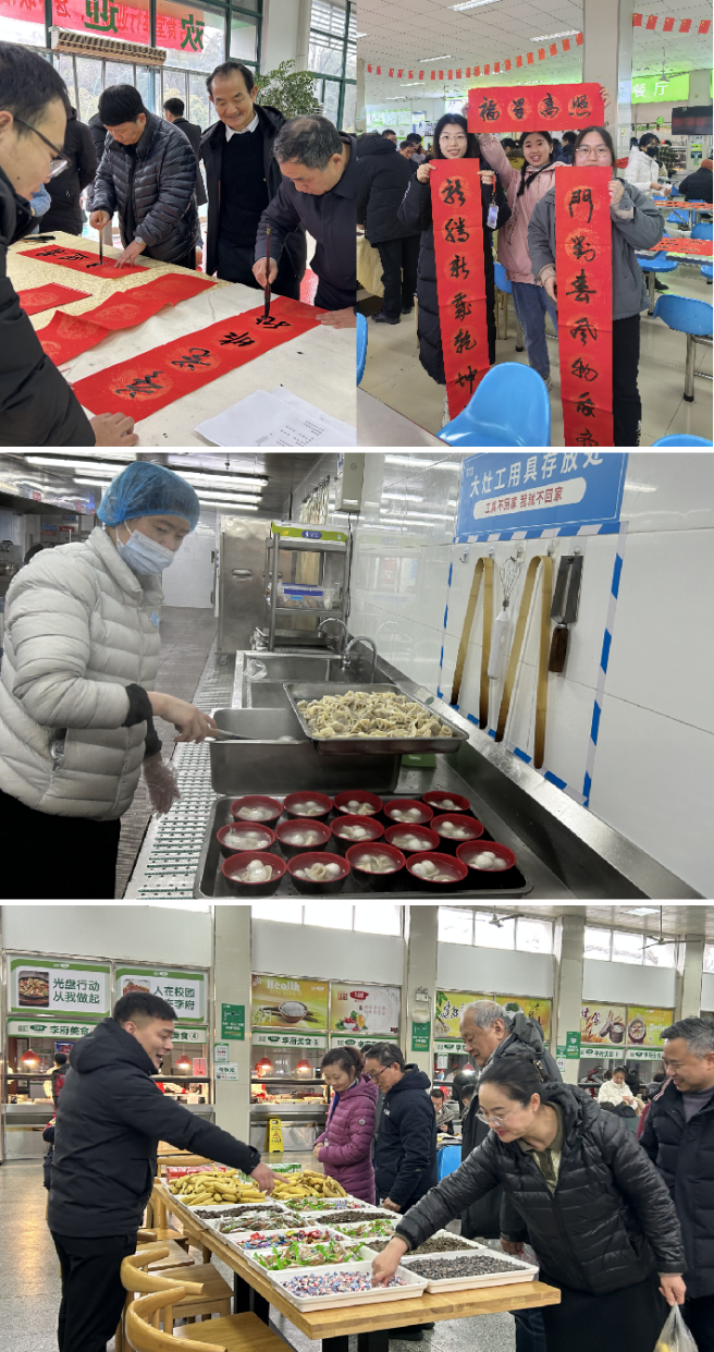 三号食堂“翰墨飘香,迎春送福”活动邀请了省书法协会的老师们现场为大家免费书写春联送福。一对对吉祥如意的春联,表达了对新年的美好期许。二号食堂精心准备了600余份南北方小年必备的汤圆、水饺等特食,让来自不同地域的职工、学生们都能感受到同样的团圆味道。一号食堂提供了丰富多样的糖果和水果供大家品尝,甜甜的糖果也让“年滋味”瞬间弥漫开来。