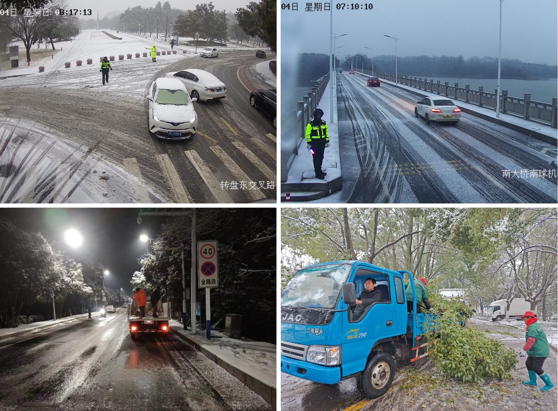 4日清晨6时左右,虽然大雪依然在下,但服务中心党员们已有序落实好大桥和积雪较多路段融雪剂泼洒事宜,提前做好防范。7时整,安保处党员带领安保公司人员在重要路口顶着寒风疏导和指挥交通。大家充分发挥团队协作优势,做好了随时应对和处置突发事件的准备。早高峰结束后,安保处立即开展视频巡查和道路巡查,落实好低温雨雪冰冻天气道路交通应急管控措施,加强了对南北门出入口、十字路口、连续下坡路段的交通管控;服务中心及时组织人员清理被大雪压断的树枝,恢复道路通畅。大家无畏严寒,坚守岗位。