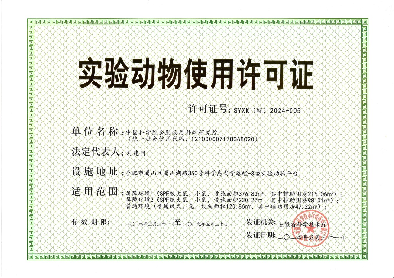 合肥物质院实验动物中心取得使用许可