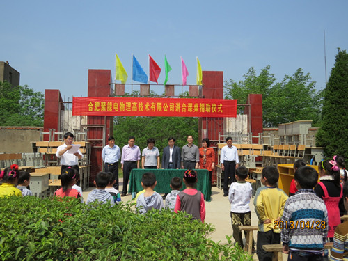 4月28日,田野里崎岖不平的小路浸润在绿的海洋里,白晃晃的太阳温暖着在场的每一个人的心身,也明媚着庐江县烟岗小学孩子们的张张笑脸。合肥聚能电物理高技术有限公司桌椅捐赠仪式正在这里热烈地进行着。