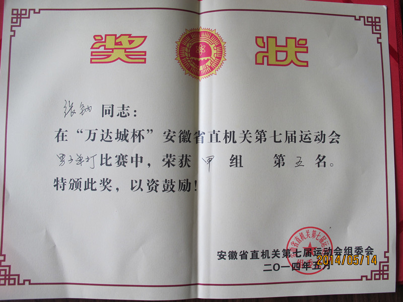 5月9日,安徽省直机关第七届运动会网球比赛男子甲组单打比赛在安徽省体育局小球中心开赛。强磁场中心张钠在小组赛中稳扎稳打,顺利出线,闯入十六强。在十六进八比赛中张钠与安徽省体育局职工对战,一开局张钠5:1领先,对方积极赶超但未成功,最终张钠以6:4进入八强。八进四比赛中,由于体力的透支,张钠3:6不敌对手,止步四强之外,获得第五名。
