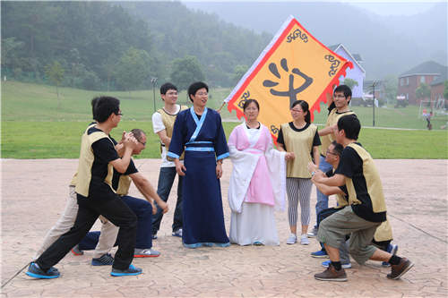 28日上午,到达培训地点后,参训人员在教练的带领下迅速进行了培训的破冰环节。32人组成了两个人数相同的同心圆,内圆和外圆所对应的成员分别介绍自己,随即内圆的成员们顺时针转动一位,与下一名成员进行自我介绍,通过这个项目,参训人员们对彼此之间都有了初步的认识。紧接着,通过随机组合,全部成员被分为“秦”、“楚”、“汉”三个国家,至此拉开了“楚汉争霸”大型拓展培训项目的帷幕。