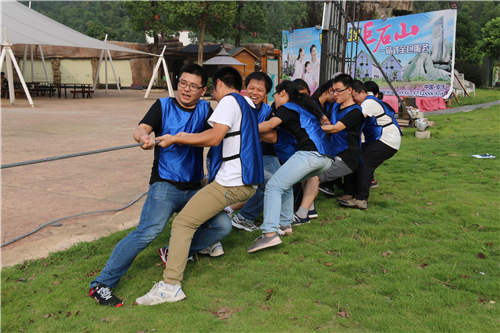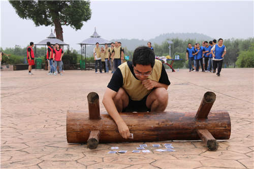 下午的正式培训项目分别是“风语者”、“巨鹿之战”和“群龙取水”。“风语者”项目是各小队成员挨个去远处放置纸牌的地方一人翻看一张纸牌,最后需要将面向下的纸牌按顺序翻开,要求队员不但有默契的配合和充沛的体力,同时也需要严格执行既定好的策略。“巨鹿之战”则是三个小队分别将自己的队员分成两个队伍,同另外两个小队的队伍拔河。这个项目既考验了小队成员们的排兵布阵的战略能力,特有的“外交”环节也极大的增强了成员们的博弈意识。在经过这两个项目的较量后,“秦国”小队不幸因积分垫底被淘汰,队员也被其余两只小队瓜分。虽然比赛有输赢,但是队员们没有因结果而沮丧,而是充分体验了项目过程中的团队意识和永不言败的拼搏精神,有的队员摔破了胳膊和腿脚,却没有停下脚步,毅然坚持完成了项目。最后的“群龙取水”要求各人对自己的位置有个明确定位,知道如何利用自己的能力让团队的利益得到最大化,也让队员们体验了互相之间的信任。