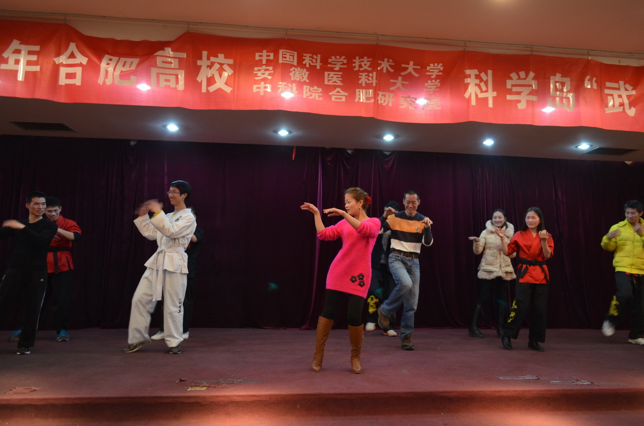 节目中,不仅显现出了武协成员们精湛的武术技巧,而且还展示了他们丰富的才艺,科学岛的傅冬梅和安医大的冯小蕊分别以《自由飞翔》和《安静了》独唱一展歌喉,唱出了属于我们年轻人的风采;固体所唐海银、孙国龙和科大代培生章魁分别展示了笛、箫之韵;科学岛的李凤娟同学以优美的舞姿展示了独舞《女人花》。伴着一段目前最流行的舞蹈——小苹果表演和现场教学,这次的“武林大会”活动在一片快乐和谐的氛围中落下帷幕。