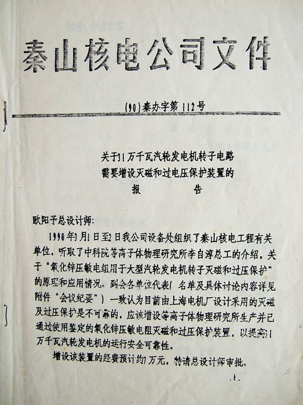 在此基础上我们进军秦山核电站。1990年秦山核电站邀请我们去上海,会同上海电机厂、华东电力设计院和浙江火电建设公司等单位共同研讨,最后一致确认应增设我所的MB11型ZnO灭磁及过电压保护装置,以确保核电机组的安全。我们为核电站精心设计研制了一台ZnO保护装置,并由所长万元熙亲自带队去核电站安装、调试。我们一起工作,一起熬夜,一起经历了中国第一座自行设计建造的核电站首次并网发电那个激动人心的时刻—1991年12月15日0时14分,我们终于又获得了成功!