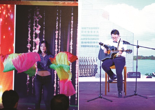 联欢会在所机关的舞蹈节目《我的祝福,你听见了吗》中开场,喜庆祥和的音乐伴着优雅的舞姿瞬间点燃了全场气氛。随后,一个个精心准备的节目陆续登场,精彩不断、让人目不暇接。小合唱《爱因为在心中》洋溢着温馨的气息;小品《科岛趣谈》贴近岛内生活,让人忍俊不禁;歌曲串烧深情演绎,不输原唱;健身舞《青春修炼手册》热情迸发、活力十足;吉他弹唱《少年锦时》潇洒帅气、引来阵阵喝彩;小品《大闹天宫》颠覆经典,笑料百出;大合唱《相亲相爱》欢乐和谐、温暖人心;老年大学模特班的服装表演《似水流年》风姿绰约、优雅从容;小合唱《听是谁在唱歌》旋律优美、感情真挚;小品《搞笑版新闻联播》紧贴热点、针砭时弊;张忠平副所长也为大家带来歌曲《昨夜的风雨》,娓娓动听,包含着对科研生活的感悟;两个可爱女生表演的《串烧舞蹈》青春动感、活力四射。最后,联欢会在大气磅礴的合唱《东方之珠》中圆满落幕。