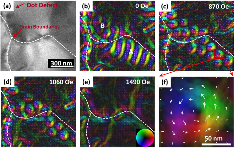 另外,课题组与复旦大学车仁超研究组合作研究了高对称的纳米盘中磁斯格明子动力学行为,利用洛伦茨电子显微镜直接观测到了前期理论预期的“团簇态”,进一步还发现了温度诱导的斯格明子“团簇态”之间特殊的动力学转变过程(图2)。这一发现扩展了人们过去对禁闭几何中斯格明子动力学的理解,为斯格明子器件的设计与制备提供了指南。相关结果以Direct imaging of magnetic field-driven transitions ofskyrmion cluster states in FeGe nanodisks为题,发表在美国科学院院刊(PNAS:Proceedings of the National Academy of Sciences of the United States of America)上(http://www.pnas.org/content/early/2016/04/04/1600197113)。